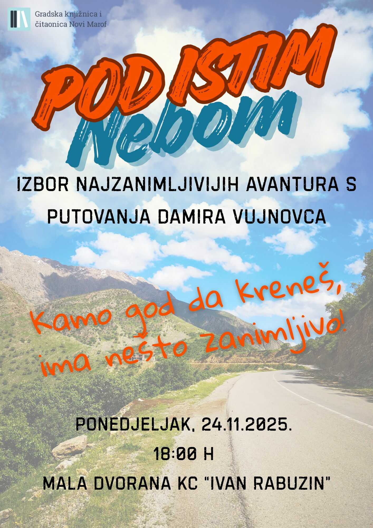 Gradska knjižnica i čitaonica Novi Marof poziva vas na putovanje oko svijeta bez da napravite ijedan korak! Pridružite nam se na putopisnom predavanju Damira Vujnovca pod nazivom „Pod istim nebom“, koje će se održati u ponedjeljak, 24. studenoga 2025. u 18 sati u maloj dvorani Kulturnog centra “Ivan Rabuzin”.