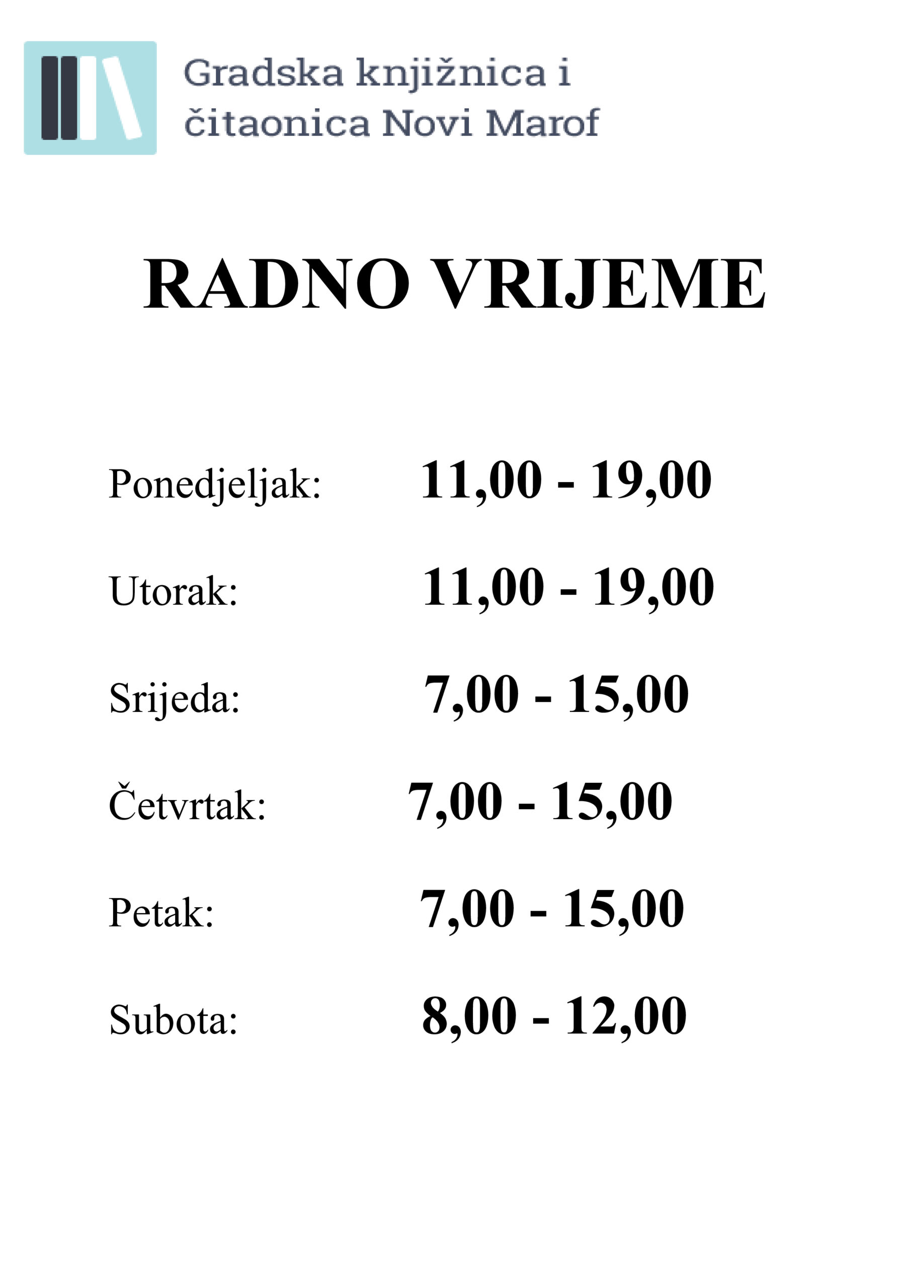 Gradska knjižnica i čitaonica Novi Marof se od 2. rujna 2024. godine vraća na njeno uobičajeno radno vrijeme.