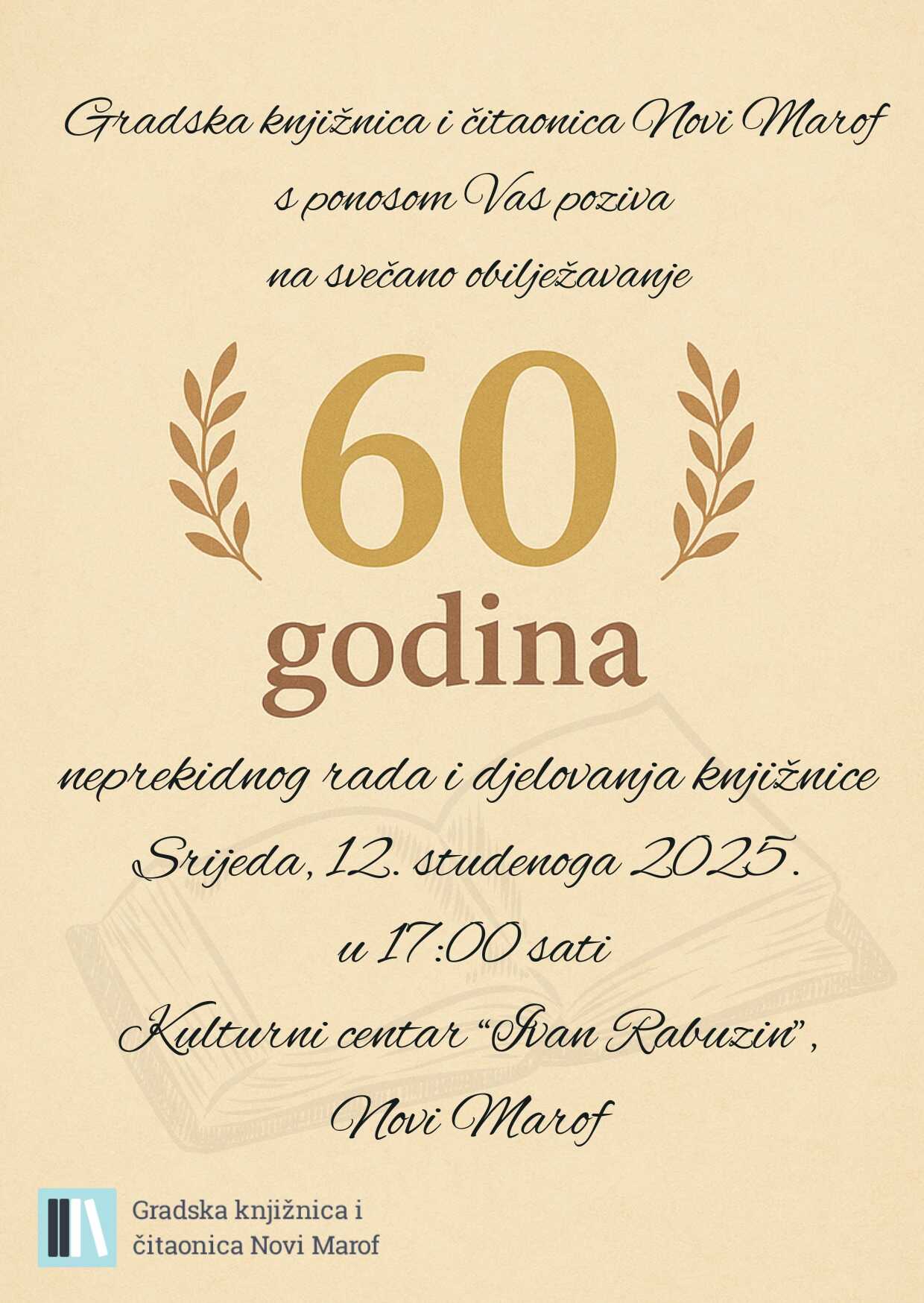 Gradska knjižnica i čitaonica Novi Marof s ponosom najavljuje svečano obilježavanje velikog jubileja, 60 godina neprekidnog rada i djelovanja knjižnice.